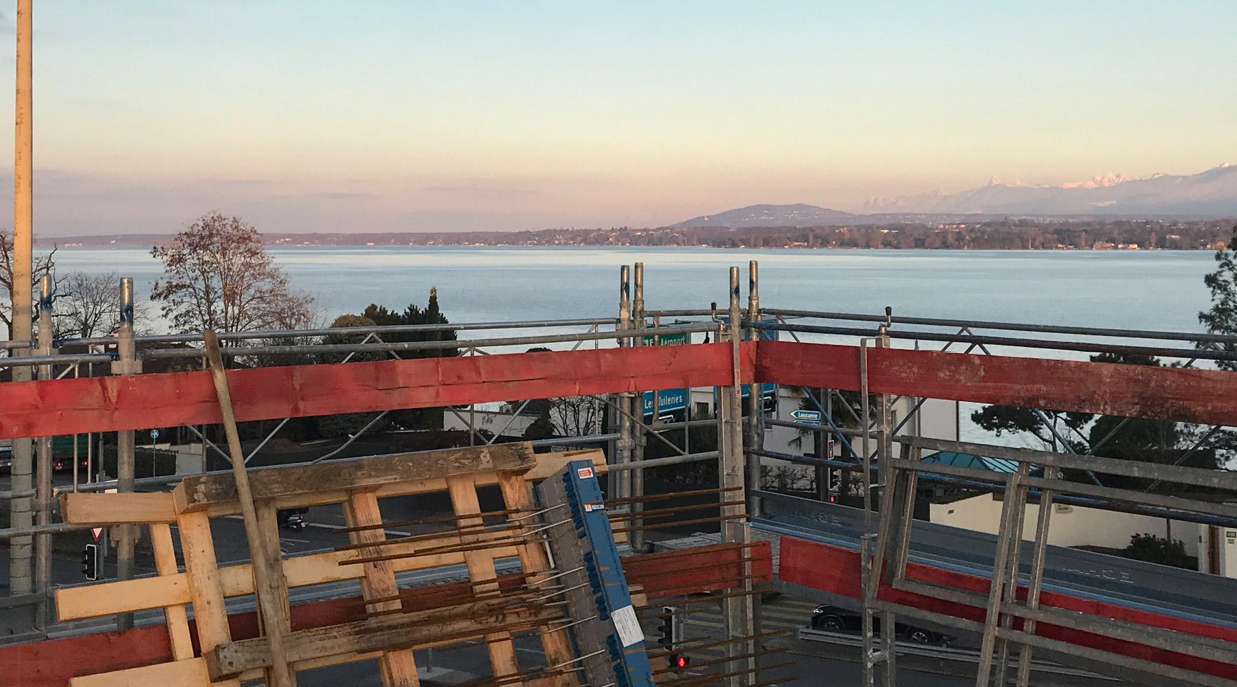 - Enceinte de fouille avec 3’500m2 de palplanches ancrées puis excavation de plus de 50’000m3. Canalisations sous radier et drainage périphérique.