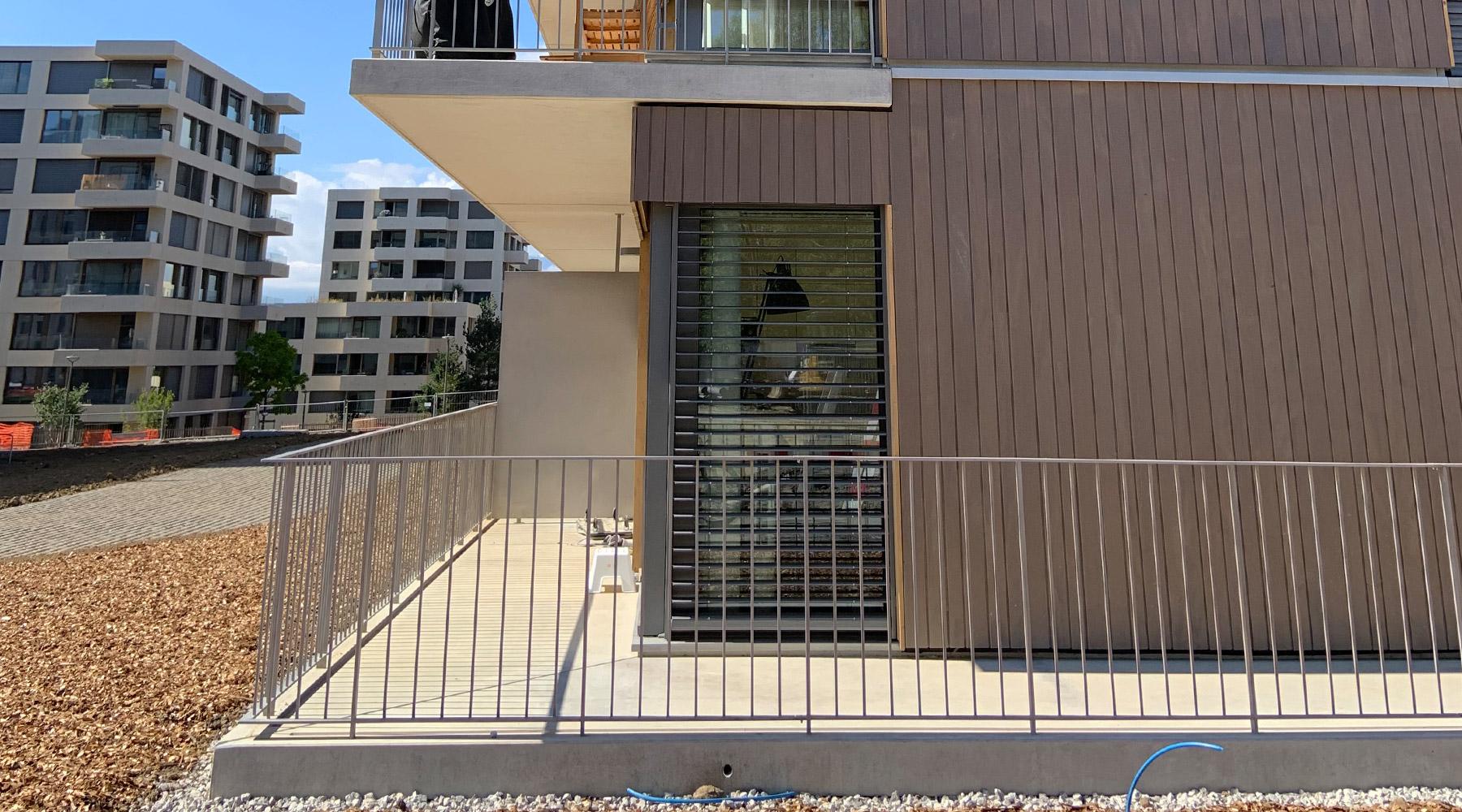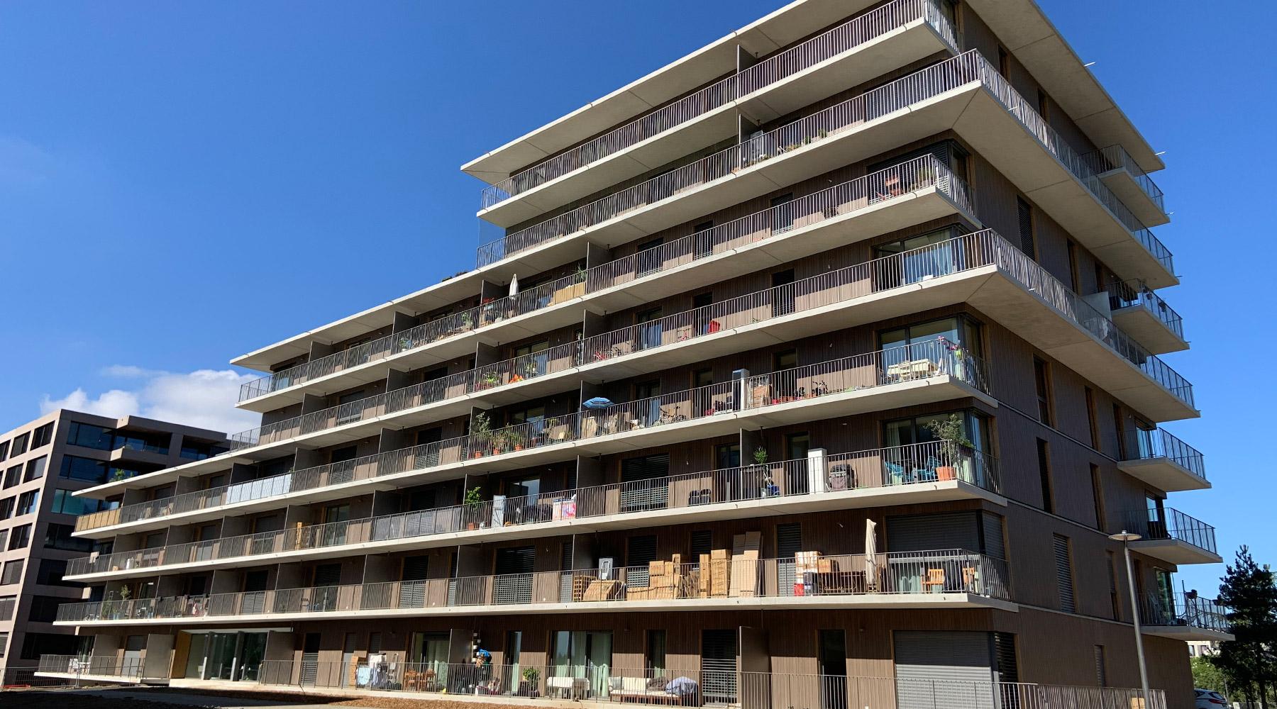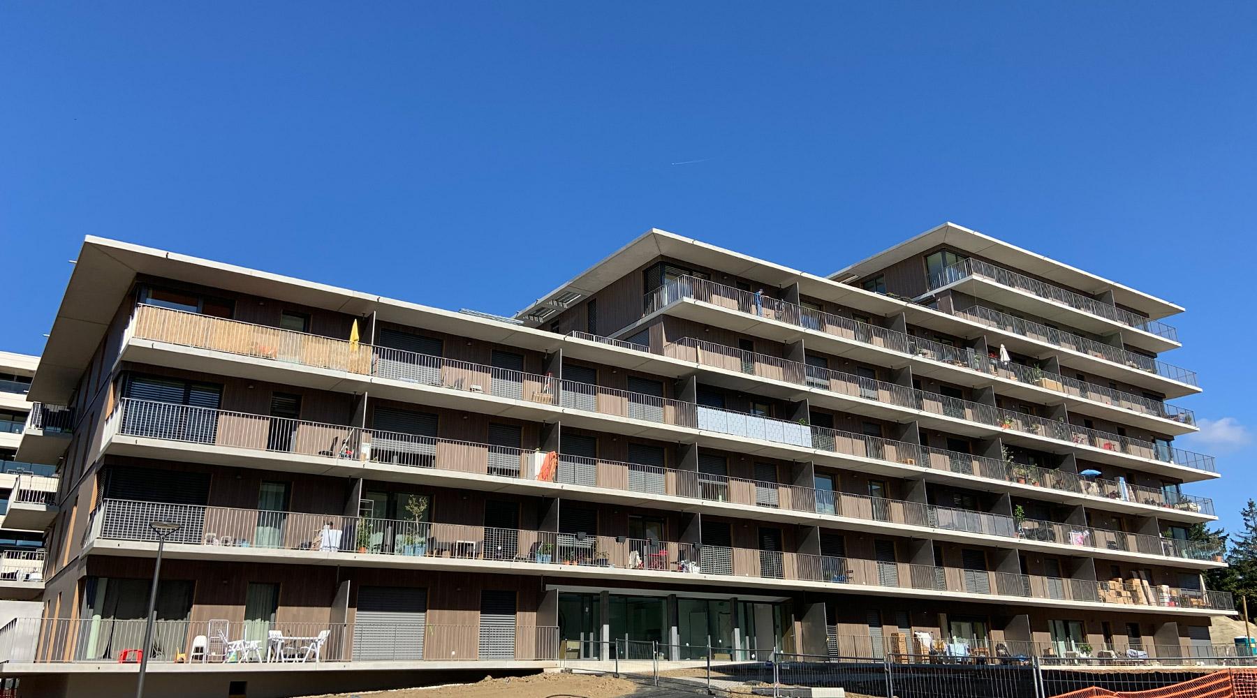 Construction d'un bâtiment de logements en béton armé avec façade en bois et puits de lumière. Construction d’un parking souterrain.