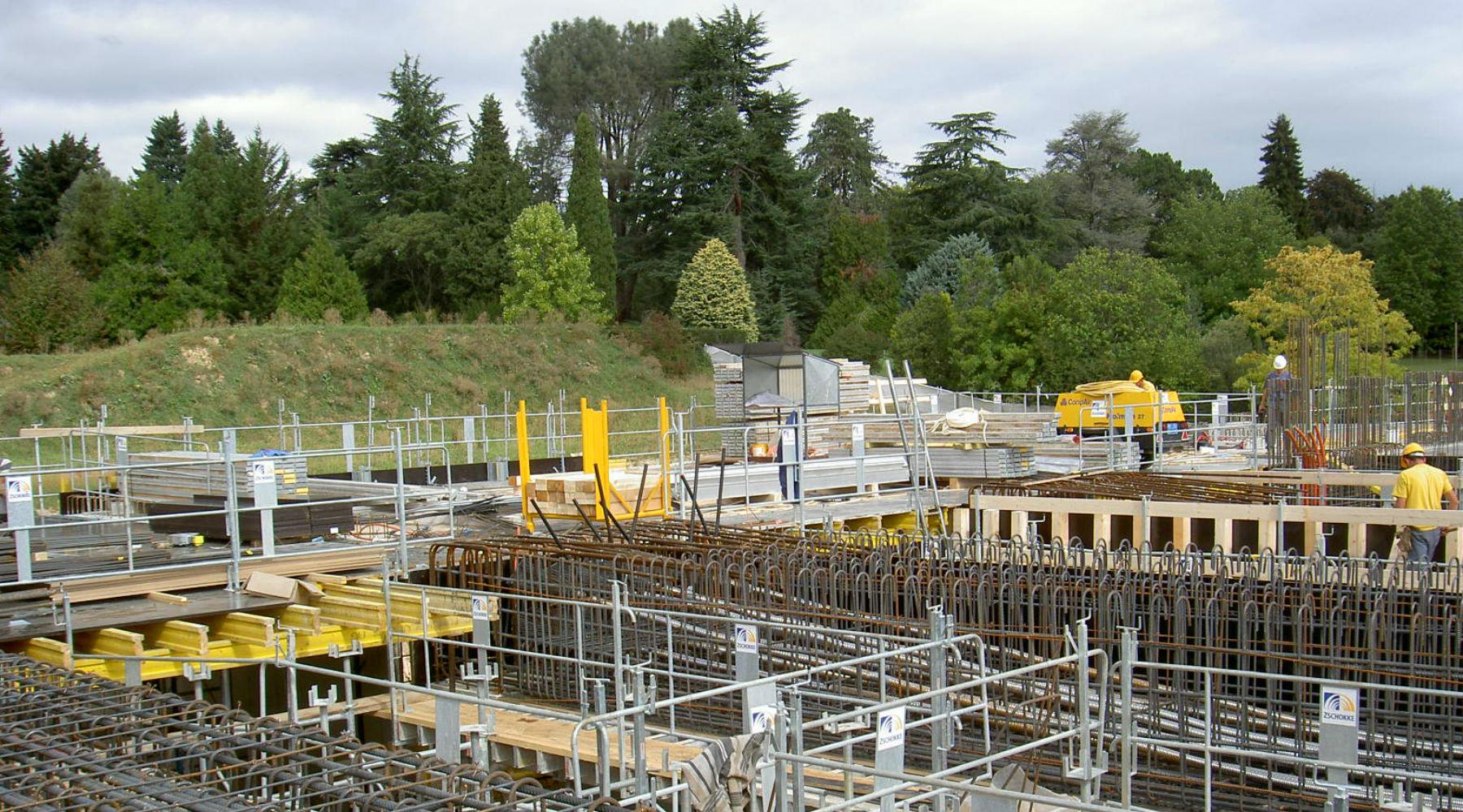 - 2 noyaux de contreventement encastrés dans le sol au moyen de pieux.
