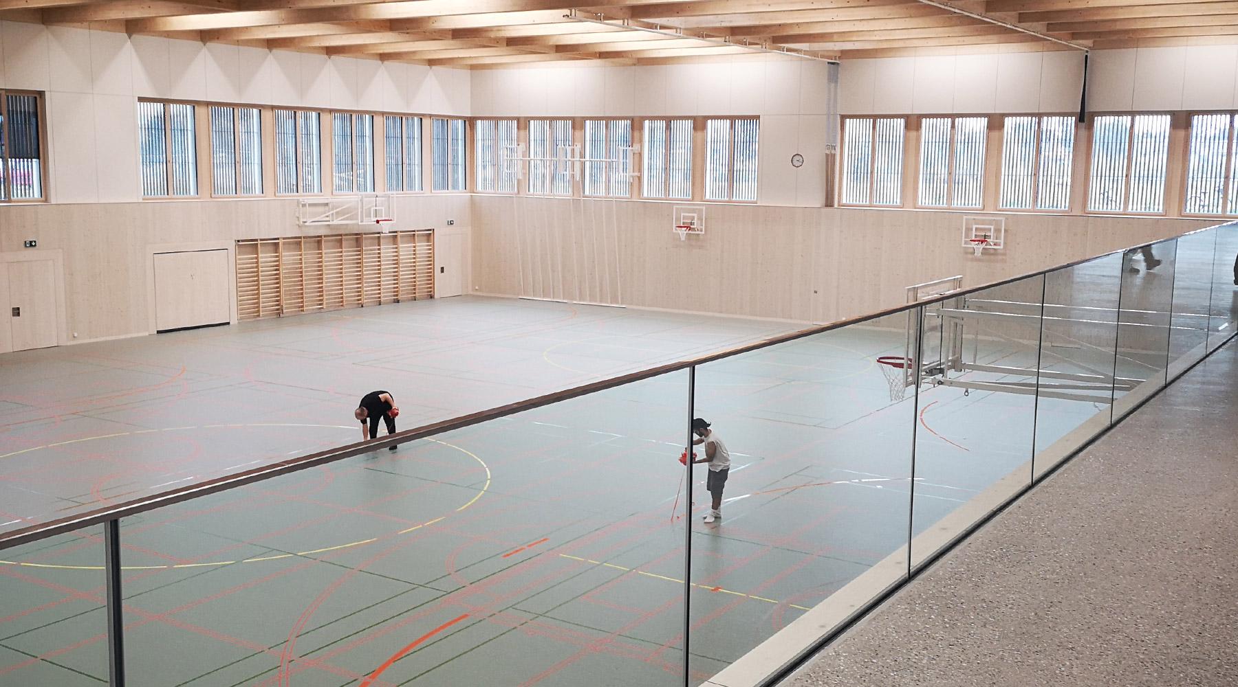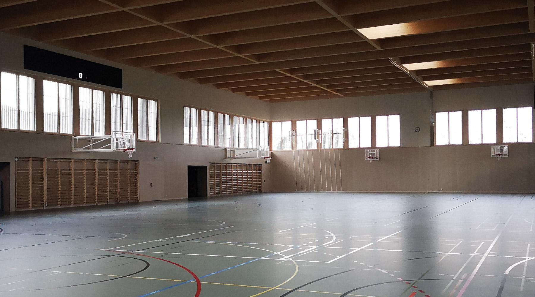 - La triple salle de gym d’une surface de 1’500m2 est portée transversalement par des poutres en bois de 30m de portée et latéralement par une poutre treillis en métal de 20m de portée suspendue aux appuis intermédiaires pour pouvoir nicher des gradins au niveau inférieur.