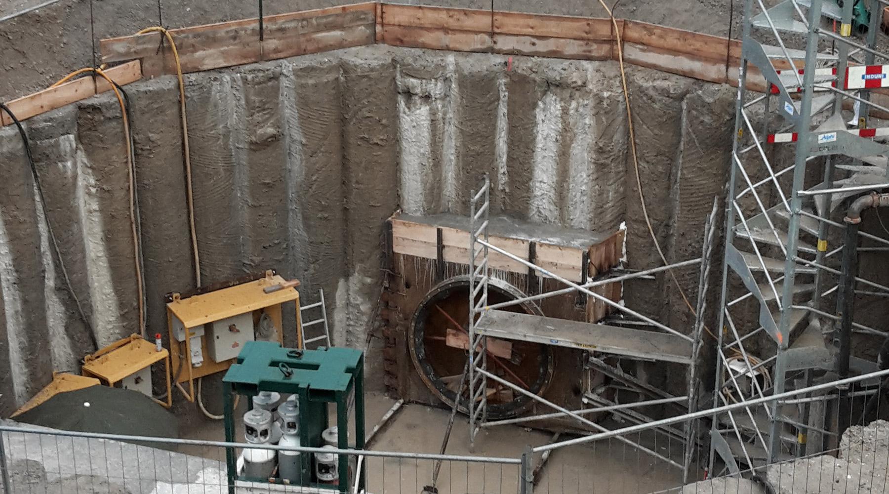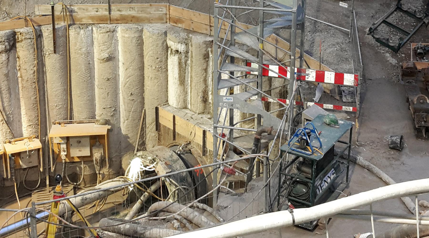 Un réseau de galeries de 1,8 km a été réalisé par microtunneliers (7 tirs droits et courbes) depuis des puits de 10m de profondeur, blindés par des pieux sécants ou des palplanches).