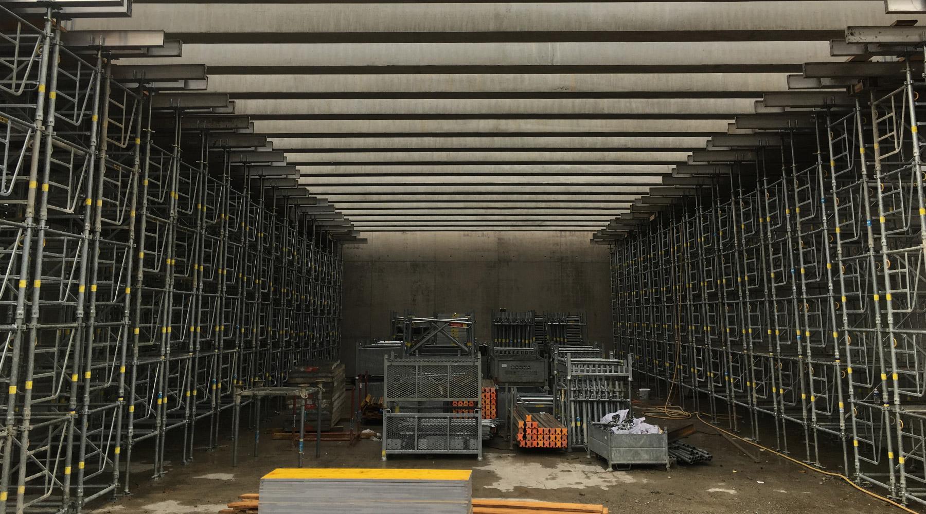 Réalisation d’un couvert en béton précontraint, sur le bassin de rétention.