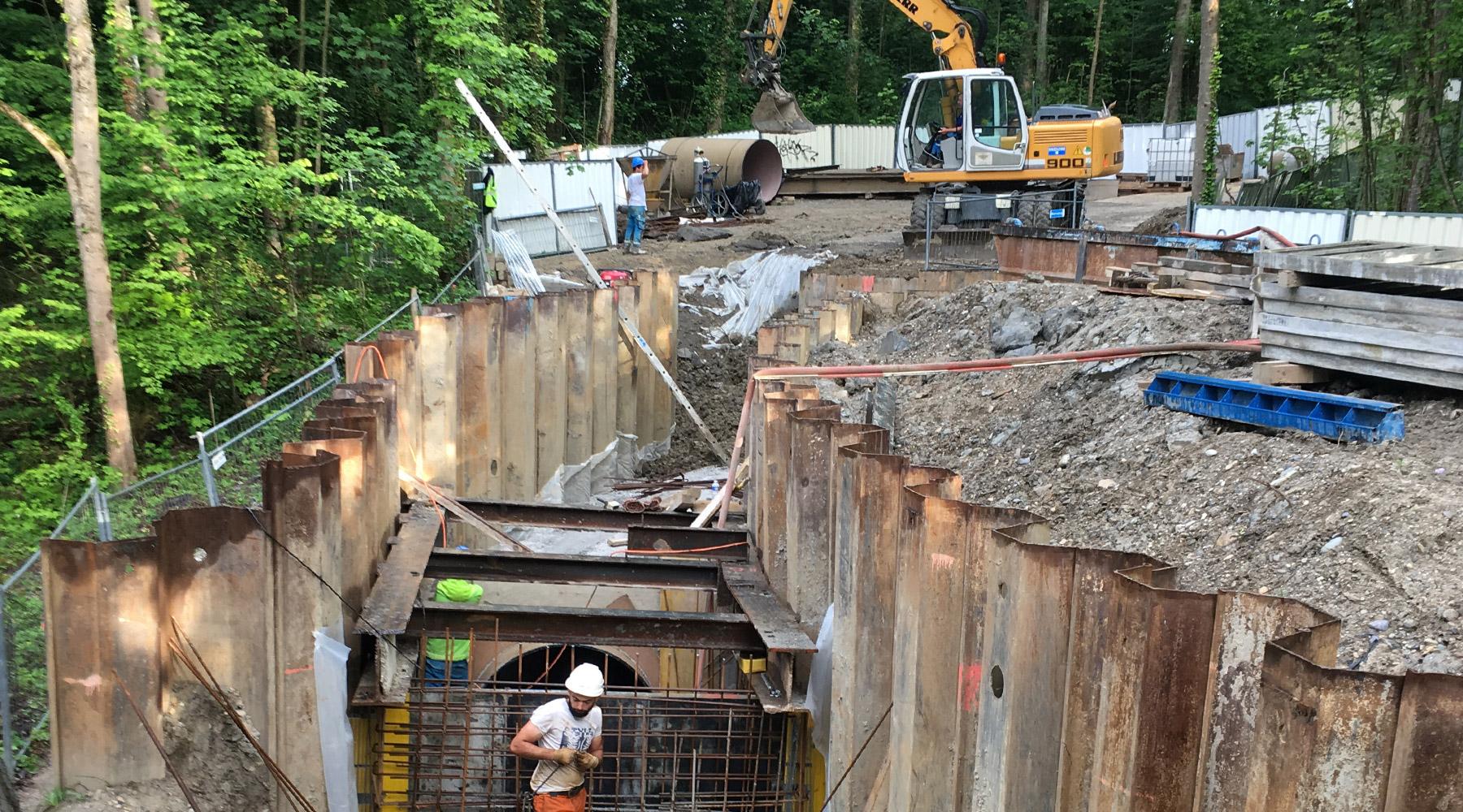 Pour réaliser le bassin de rétention totalement enterré, des travaux spéciaux ont été nécessaires (enceinte de fouille réalisée en parois moulées, barrettes, paroi clouée, palplanches). Le terrassement a été réalisé en taupe.